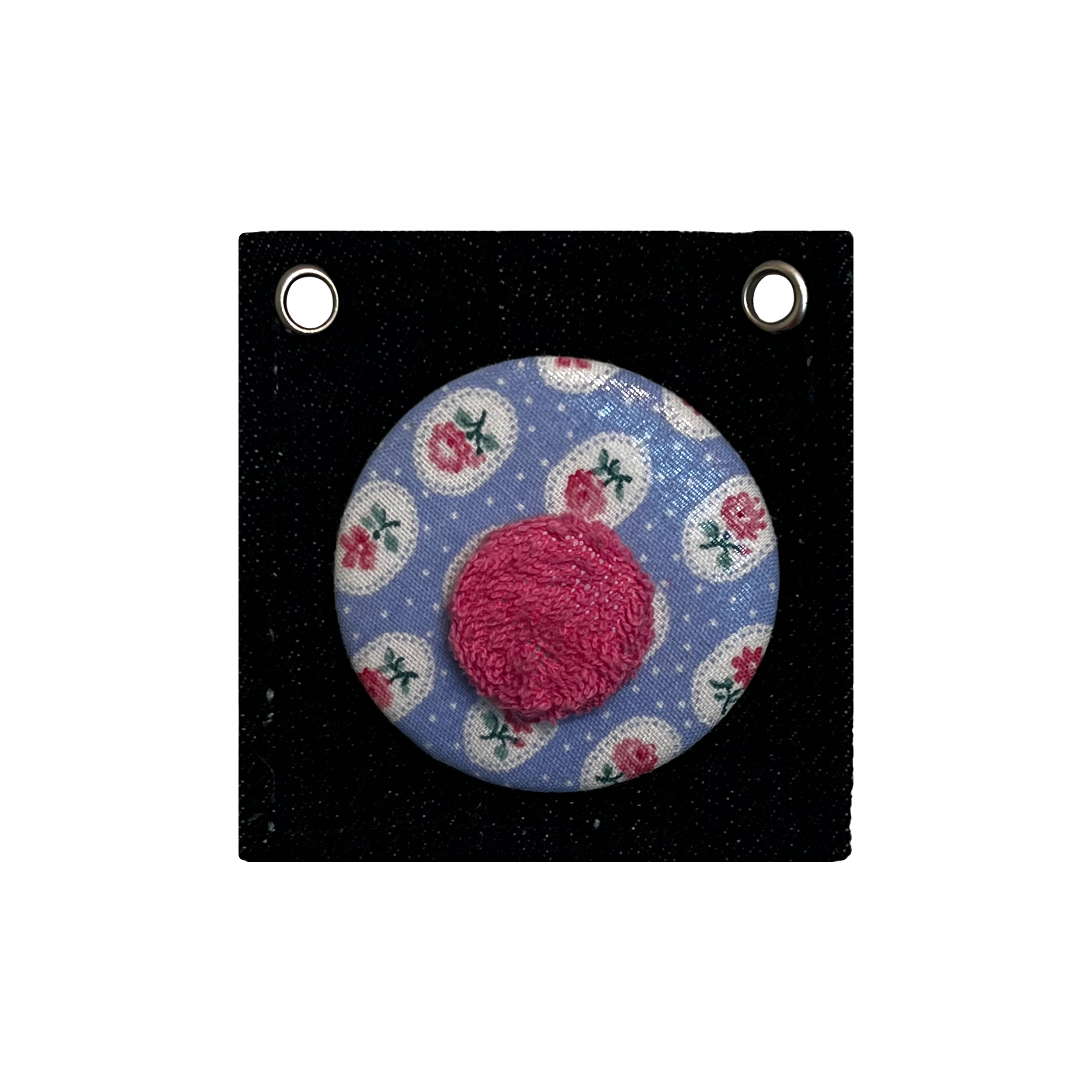 “Touch Button,” 2024, salvage cotton fabric on metal pinbacks mounted on denim display