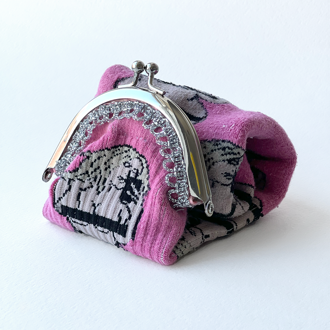 “Evolved Fertility Figure,” 2024, found sock with salvage lurex trim, metal purse frame, adhesive, polyester, polyester thread